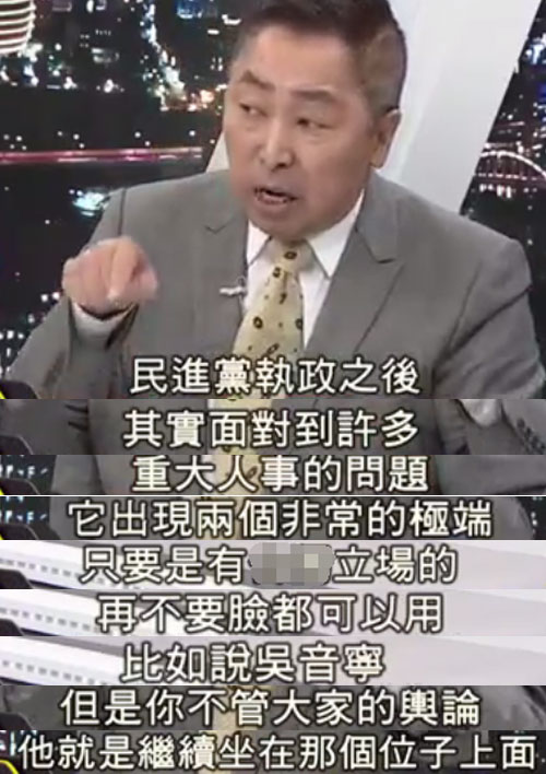 唐湘龍強調,自從民進黨上臺之后,但凡遇到重大的人事任命,皆是只問顏色,不看對錯,吳音寧、吳茂昆,兩個“吳氏生非”,即使外界的爭議再大、再不要臉,他們也依然可以坐在那個位子上;而反觀管中閔,只因為不是“綠”的,即使再要臉,民進黨也會想盡辦法將他拉下來,“臺灣走到今天這個地步還有救嗎?”