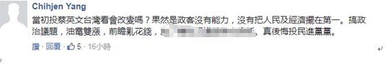 有網(wǎng)友稱“一直很討厭蔡英文,但在就任前對(duì)她還有一點(diǎn)期待”,因?yàn)椤罢f不定她會(huì)提出類似老農(nóng)津貼或老人年金的政策”,又或者是“對(duì)22K青年、孕婦提出有感的‘政策性買票’”,如此的話,即使她在“勞基法”上亂搞,也還是會(huì)有不少的人“體諒她”。但萬萬沒想到,蔡英文提出的不是要預(yù)支子孫好幾兆新臺(tái)幣的“前瞻計(jì)劃”,就是不靠譜的“綠能發(fā)電”,該網(wǎng)友表示,按這樣下去很可能到2025之后,臺(tái)灣會(huì)變成一個(gè)電價(jià)高負(fù)債高物價(jià)高收入?yún)s低的“三高一低”地區(qū),“然后臺(tái)灣民眾還是要在缺電跟PM2.5兩者間二選一”,痛批道“前瞻跟能源政策將淘空臺(tái)灣,但蔡當(dāng)局就是要硬干”!
