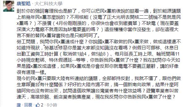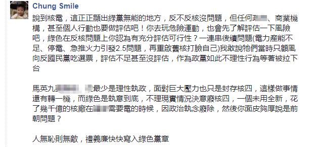 據(jù)臺(tái)灣《中時(shí)電子報(bào)》報(bào)道,有網(wǎng)友指出,他“有投蔡英文,結(jié)果似乎很快就后悔了”,原因在以下幾點(diǎn):首先,民進(jìn)黨不僅各種撕毀選前的反核承諾,還用破壞生態(tài)的方式大量搜刮土地來建風(fēng)力與太陽能電廠,而遇到全臺(tái)大停電時(shí),賴清德竟也對(duì)電價(jià)調(diào)漲不諱言;第二,對(duì)勞工的承諾也是“0項(xiàng)達(dá)成”;第三,對(duì)“同志議題”的退縮;第四,對(duì)外要大家團(tuán)結(jié)一致,但內(nèi)部卻用“臺(tái)灣價(jià)值”去試圖清算他人,但每個(gè)喊“臺(tái)灣價(jià)值”的人說出來的定義卻都完全不一樣;不僅如此,現(xiàn)在還要將黨政軍的手重新伸入大學(xué)迫害大學(xué)自治!