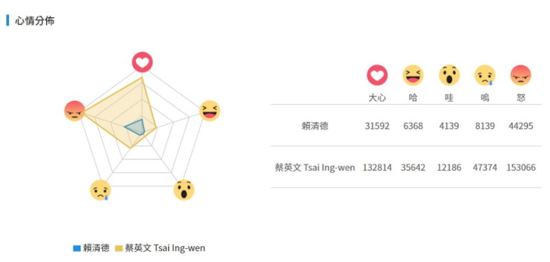 臺(tái)媒通過(guò)調(diào)查蔡英文、賴(lài)清德臉譜網(wǎng)發(fā)現(xiàn),這一年內(nèi)(20170510—20180510)跟進(jìn)兩人話題并給予按鈕回應(yīng)的網(wǎng)友當(dāng)中,排除按“贊”的人次,按下心情按鈕的人則以“怒”最多,接著才是愛(ài)心,表示對(duì)他們的言論感到不滿的人是極多數(shù)。