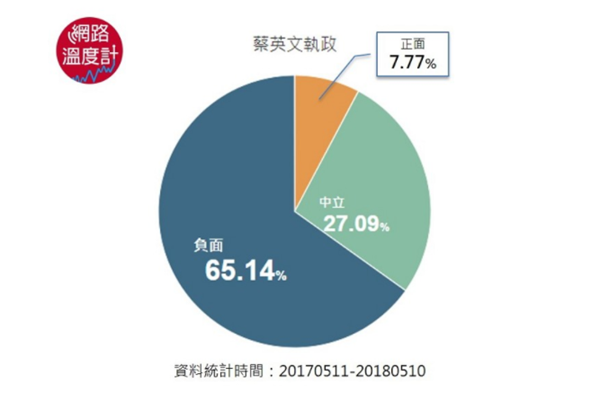 通過上圖我們不難看出,在最近一年時間里,網絡上只有7.77%的人對蔡英文執政有正面評價,其余部分,不滿意的評價高達65.14%。要是放在淘寶上,這樣的賣家可能早就倒閉了……