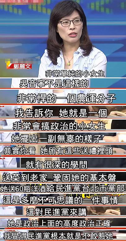 “行政院”前發(fā)言人鄭麗文則直言,吳音寧分明就“非常會搞政治”,并且因?yàn)樗诿襁M(jìn)黨高層眼中是“政治上高度正確”,所以民進(jìn)黨團(tuán)里根本沒人敢惹她!