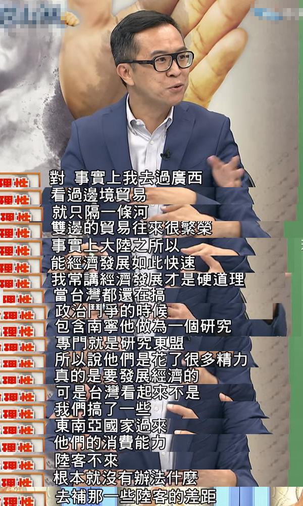 在節目中,一位去過廣西見到邊境貿易的嘉賓說道:“就只隔一條河,雙邊的貿易往來卻很繁榮”,他還說:“當臺灣還在搞政治斗爭的時候,他們(大陸)是花了很多精力真的是要發展經濟的”。