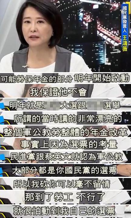 王鴻薇也直言不諱的表示,民進黨和蔡英文認為大部分軍公教都是國民黨的選票,所以砍起年金來毫不留情,但勞工可是民進黨自己的選票,自然不敢輕易動