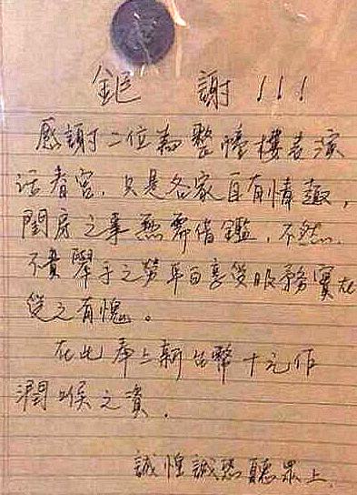 只見紙條上寫著:“巨謝!感謝二位為整棟樓表演活春宮,只是各家自有情趣,閨房之事無須借鑒,不然不費舉手之勞平白享受服務實在受之有愧,在此奉上新臺幣10元作潤喉之資,誠惶誠恐聽眾上”,字里行間透露出被人擾了清夢的無奈。PO主也好笑地表示,一大早看到住戶的信箱貼了這個,也是暈了,“半夜沒聽到聲音有點無言,會不會明天又貼一張變50嘞”。