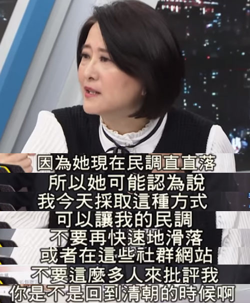 對于蔡當局的行事風格,身為臺北市議員的王鴻薇顯然習以為常,她表示,民進黨的做法,正是由于蔡英文的民調近來一路走低,在“綠營”看來,采取這樣的方式,能夠降低網絡上的批評指責聲,讓民調不至于快速滑落,但王鴻薇也強調,“民進黨所謂的監控,已經變成了一種鉗制,就好像清朝時候的‘文字獄’。”