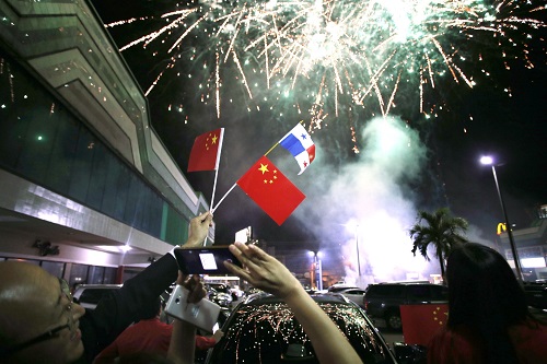 資料圖:6月12日,在巴拿馬首都巴拿馬城的華人社區,人們在巴拿馬與中國建交的慶;顒由吓臄z煙花。新華社發
