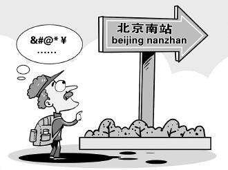 日前,鐵道部下發通知,為規范鐵路車站站名的英文譯法,鐵路車站站名的英文拼寫統一采用漢語拼音,“東南西北”方位詞作為車站站名的固有部分,不按英文音譯。涉及“地名+方向”的站名,方位詞統一采用漢語拼音。如“北京西站”的英文翻譯為“Beijingxi Railway Station”(9月18日《新京報》)。
