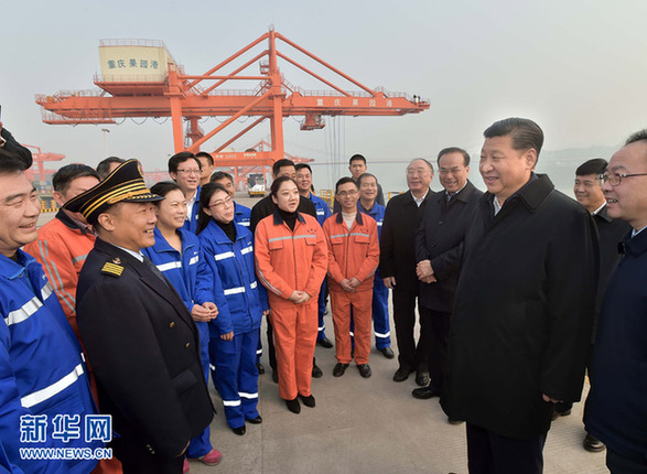 1月4日至6日,中共中央總書記、國家主席、中央軍委主席習近平在重慶調研。這是1月4日下午,習近平在重慶兩江新區果園港與現場作業人員親切交談。新華社記者 李濤 攝