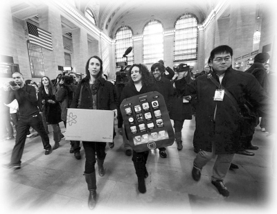 圖為2月9日,美國紐約,多個社會團體的抗議者到紐約中央車站旁的蘋果專賣店,遞交請愿書,呼吁蘋果公司改善海外代工廠的工作環境。