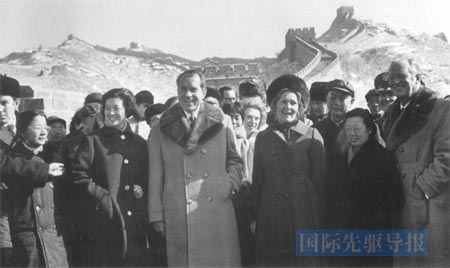1972年2月24日,美國總統(tǒng)尼克松和第一夫人帕特·尼克松在中國長城上和一群人合影。圖片:美聯(lián)社