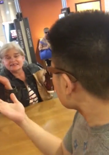 最終,罵人的老太太轉(zhuǎn)過身來,直接對著相機(jī)。她不停揮舞著手,喊道:“嗨!我是美國人。我有權(quán)在這里用餐。你們快挪開屁股,”她大聲大叫,指著沈思文。
