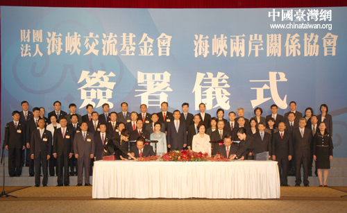11月4日下午,兩岸兩會就海運直航等議題簽署四項協議。圖為海協會會長陳云林、海基會董事長江丙坤正在簽署文件。(田云鵬攝)