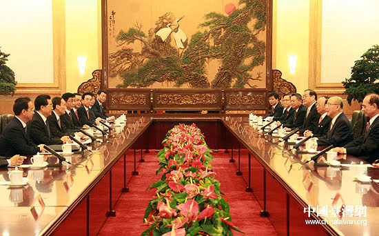 中共中央總書記胡錦濤26日下午在人民大會(huì)堂會(huì)見了中國國民黨主席吳伯雄率領(lǐng)的中國國民黨大陸訪問團(tuán)全體成員,并與吳伯雄舉行會(huì)談。(來源:中國臺(tái)灣網(wǎng))