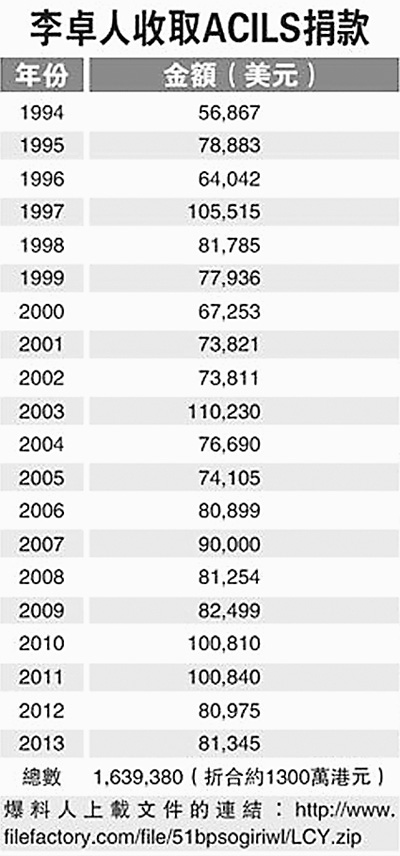 大公報(bào)文章說,香港網(wǎng)民“旺角腦場(chǎng)起底組”近日上載于網(wǎng)絡(luò)的大量文件揭露,李卓人所領(lǐng)導(dǎo)的“香港職工會(huì)聯(lián)盟(簡(jiǎn)稱職工盟)”號(hào)稱政治中立組織,卻自1994年以來,每年均向美國(guó)國(guó)家民主基金會(huì)(NED)旗下的美國(guó)國(guó)際勞工團(tuán)結(jié)中心(ACILS)申請(qǐng)5萬至10多萬美元資助,至今已接受合共多達(dá)近164萬美元,折合約1300萬港元捐款。
