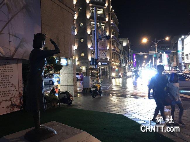 左面為夜幕中的慰安婦銅像,對面即是“日據”時期的日本百貨。(圖片來源:香港中評社)