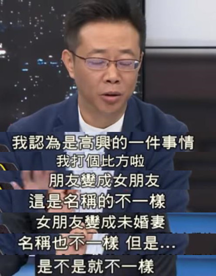 臺灣政論節(jié)目《少康戰(zhàn)情室》中,民進黨“立委”張宏陸就此事欣喜表示,這次改名字是個高興事兒。為了論證自己的結(jié)論,張進行了這樣一番闡述:你看,朋友變女朋友,名稱不一樣!女朋友變未婚妻,名稱也不一樣!是不是親密度就不一樣了!