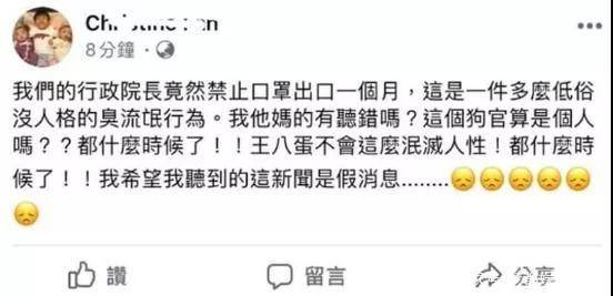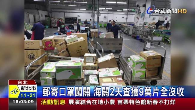 臺媒報道,1月底的兩天內(nèi),臺灣海關(guān)沒收了9萬多片臺灣民眾攜帶或寄送給大陸的口罩。臺財政部門在社交媒體上赫然警告:“口罩管制來真的,休想挑戰(zhàn)公權(quán)力。”