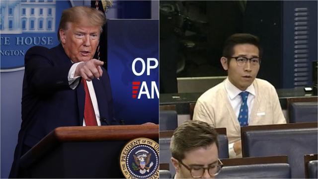 臺籍上海東方衛(wèi)視駐白宮記者張經(jīng)義早前在美國總統(tǒng)特朗普的記者會上提問。(圖片來源網(wǎng)絡)