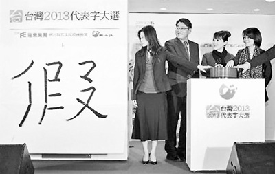 由《聯合報》等單位主辦的臺灣2013代表字評選12月9日揭曉,“假”字獲選年度代表字。據主辦方介紹,票選前10名分別為假、黑、毒、亂、謊、悶、混、真、醒、安、食,其中“食”與“安”同票并列第10名,反映出民眾對食品安全的渴望。