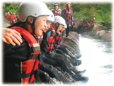 教練配合地形,設計多項關卡,以增加娛樂效果和團隊的親近感。水簾之上,七八人交叉搭肩,一起滑下潭去。深不見底的水潭阻擋行路,教練拋過一條繩索,大家拉著它逆著強大水流,與下沖的力度抗衡。在多個溪段,一伙人就這樣拉著繩子或水或岸,互相幫助向上游挺進,這種合作,很容易增強團隊默契和友誼。在一個開闊的潭里,教練教起了水上芭蕾陣,20多人仰臥水中以腳夾腰以手劃水,結成一條S形的人龍,在水中搖擺著挪動,誰做得不默契,龍陣就斷了。