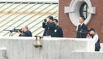 圖片說明:10月10日臺“雙十大會”現場,臺“國安”單位高度警戒,配置十幾名狙擊手。圖中理平頭的就是 平日緊跟陳水扁的忠誠貼身隨扈,昨天也加入狙擊手行列。(臺灣《聯合報圖》)