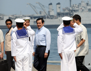 當天上午,馬英九在臺“國安會”秘書長蘇起、“國防部長”陳肇敏等人陪同下,搭乘專機南下左營海軍基地,分別前往水星碼頭及柴山山訓場視導并慰勉臺軍官兵。