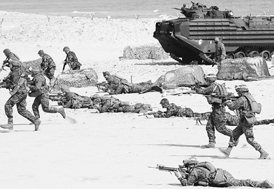 3月29日,在韓國慶尚北道浦項,士兵在進行登陸演習。“禿鷲”韓美聯(lián)合野外機動演習于3月1日開始,到4月30日結(jié)束。新華社發(fā)