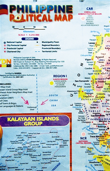 這是一張由菲律賓國(guó)家地圖繪制與信息資源總局認(rèn)證、2008年版的菲律賓行政地圖,圖中將黃巖島(菲方稱Scarborough Shoal,圖中箭頭所指)清楚地標(biāo)記在東經(jīng)118度菲律賓的邊界線之外。新華社記者許林貴2009年2月23日攝。本報(bào)資料照片