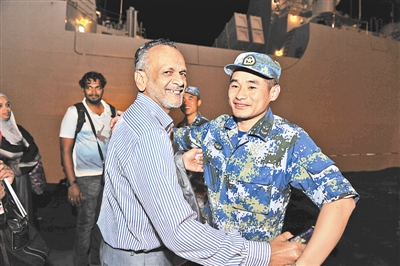 臨沂艦于當地時間7日凌晨1時41分安全順利抵達吉布提港。圖為海軍官兵與撤離的斯里蘭卡公民擁抱告別。熊利兵攝