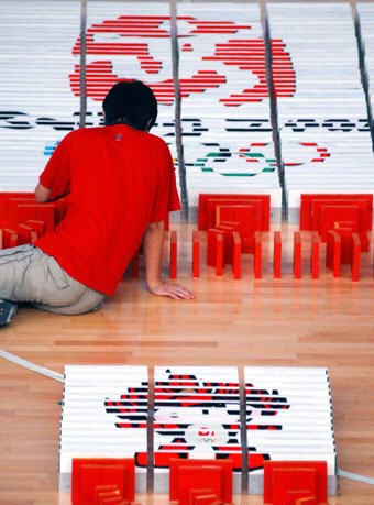兩岸青年共迎奧運(yùn)。圖為用多米諾骨牌擺出的北京奧運(yùn)會(huì)徽和福娃圖像。