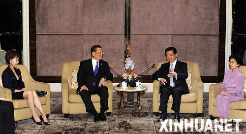 11月14日,中共中央總書(shū)記胡錦濤和夫人劉永清在新加坡會(huì)見(jiàn)中國(guó)國(guó)民黨榮譽(yù)主席連戰(zhàn)和夫人連方瑀。(圖片來(lái)源:新華社)