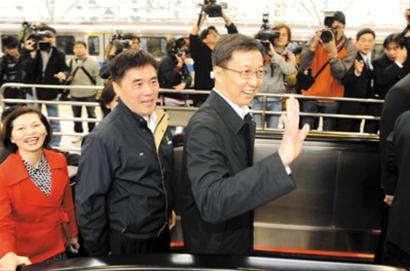 4月7日,率團到臺北訪問的上海市長韓正在臺北市長郝龍斌(左二)的陪同下搭乘臺北捷運淡水線。圖為韓正向搭乘捷運的臺北市民揮手致意。
