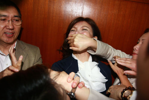 臺灣立法機(jī)構(gòu)21日審查關(guān)于開放大陸學(xué)生來臺就學(xué)的“陸生三法”。教育主管部門及大學(xué)校長紛紛表示支持,民進(jìn)黨民代則激烈反對。圖為綠營民代捂住國民黨民代趙麗云(中)的嘴阻撓會議進(jìn)行。