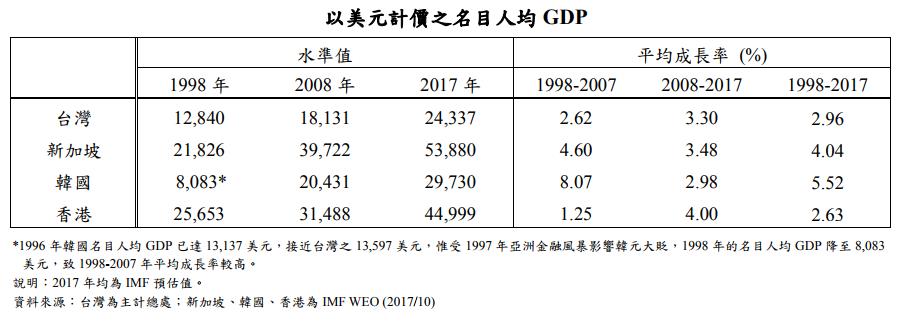 2018年4月2日,臺灣“立法院”第9屆第5會期“財務委員會”第11次全體“委員”會議中發布的“20年來(1998-2017)臺灣經濟成長率、通貨膨脹率及人均GDP與新加坡、韓國、香港之比較。”報告中明確顯示,無論以PPP(平均個人所得成長率)計價之人均GDP,還是以美元計價之名目人均GDP,臺灣都排在香港之后。