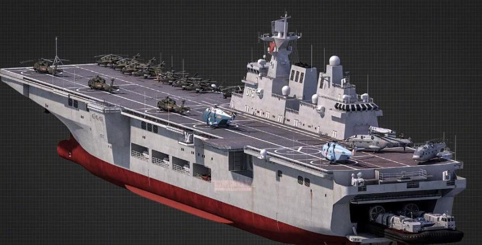 075采用直通甲板,能搭載30架各型號直升機,可同時起飛4架直升機。同時,075還擁有寬敞的塢艙,可作為兩棲車輛和氣墊登陸艇的母船,運送士兵、步兵戰車、主戰坦克等展開登陸作戰。