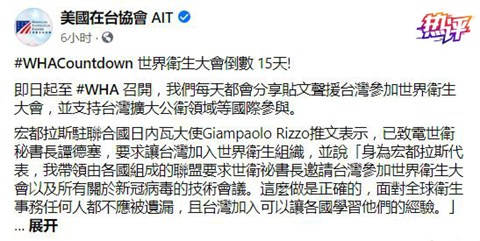 美國對世衛組織(WHO)的“嫌棄”,舉世皆知。美國總統特朗普幾個月來一直指責世衛組織對新冠肺炎疫情防控不力,前不久更是直接宣布斷絕對世衛組織的資助。但在距離世衛大會(WHA)舉行倒數15天的時候,“美國在臺協會”(AIT)卻在宣布:將每天分享貼文,聲援臺灣參加世衛大會,并支持臺灣擴大國際參與。