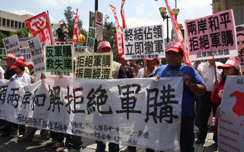 資料圖片:臺灣民眾舉行集會,反對向美國購買武器。(圖片來源:臺媒)