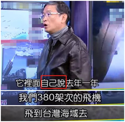 第三,在報道大陸媒體涉臺內容時,綠媒還常常會在細節(jié)處做“微調”,比如同一期節(jié)目中,嘉賓聲稱,文章“自己說”,“去年一年我們380架次的飛機飛到臺灣海域!