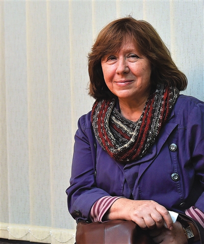 新晉諾貝爾文學獎得主阿列克謝耶維奇在公寓接受記者采訪。