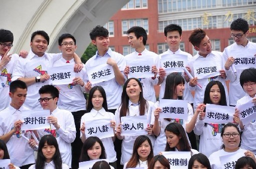 我們不妨通過照片解讀一下這些“天之驕子”在內心深處的表白,一個男孩子也敢于高舉“求強奸”的橫幅躋身于一群同處幾年的異性之中。或許我們可以認為他是校園的愛情的失敗者,在面對成雙入對的校園風景里他感受到了失落;亦或許是他對于所謂的“高、帥、富”的嫉妒與對真愛的渴求。如今,即便在象牙塔下,校園的愛情也遭受了金錢的侵襲,相對封閉的校園已經接受了社會化的融入。