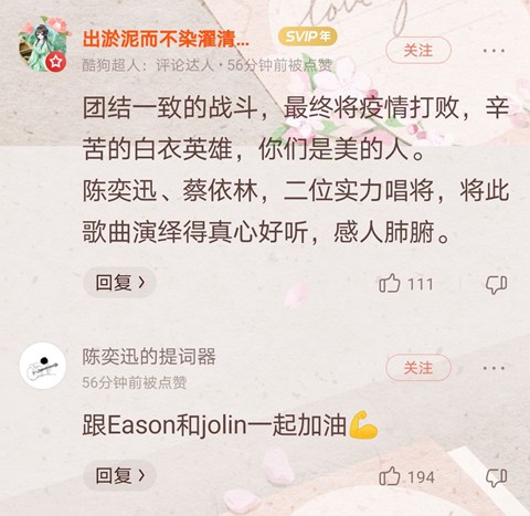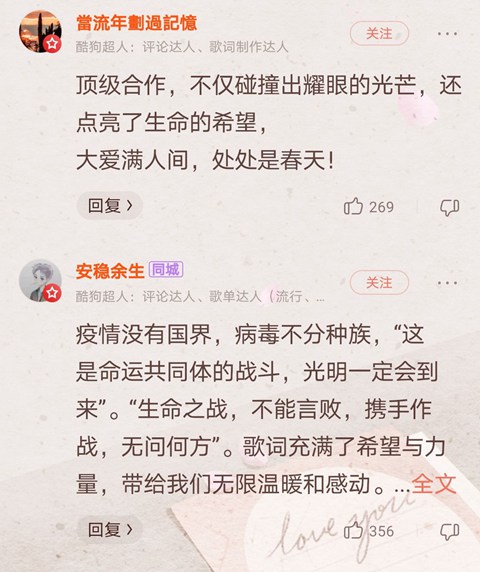 《Fight as One》的MV當中,除了配上各國醫護人員的相片作致敬外,還有各地民眾在抗疫下的生活日常。雖然每張照片里的人都戴著口罩,但神情都充滿希望、給人以力量。歌迷們一片點贊,紛紛留言“神仙組合,超好聽”“感恩那些為我們負重前行的人,愿世間安好,愿英雄平安,愿你我無恙”“我們一起向世界傳播正能量,真正有大國擔當的中國,我驕傲”。