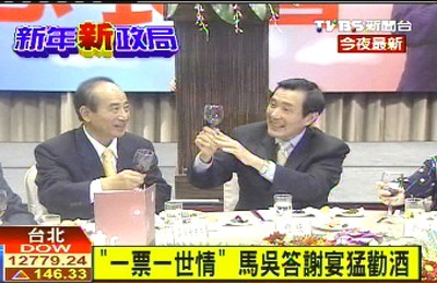 據(jù)臺(tái)灣TVBS網(wǎng)站報(bào)道,馬英九和吳敦義1日晚出席感恩餐會(huì),答謝競(jìng)選干部在選戰(zhàn)過程中的幫助,馬英九深深三鞠躬表達(dá)感激,并說“一張票一世情”。不過,馬吳二人真的太開心,吳敦義在現(xiàn)場(chǎng)猛勸酒,不知道是不是多喝了,馬英九離開餐會(huì)的時(shí)候,講話變得好輕柔。