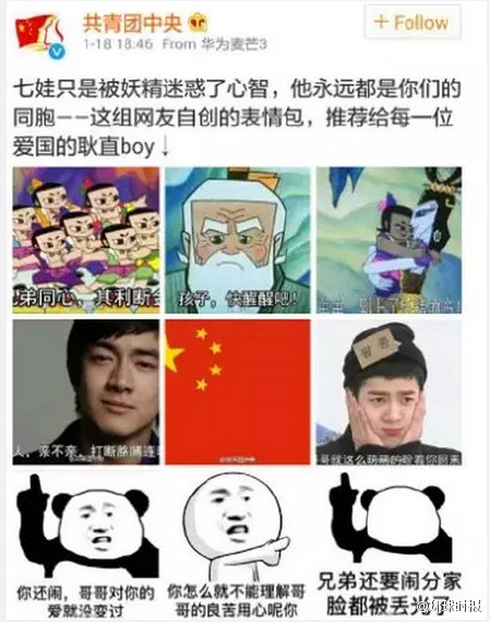 當許多人還在憂心民進黨重新在臺灣執(zhí)政會否帶來惡果時,一場由兩岸草根網(wǎng)友打響的“戰(zhàn)爭”卻意外地率先在Facebook登場了。這場以“發(fā)圖片表情互嗆”方式展開的網(wǎng)絡(luò)混亂,又被稱為“FB表情包大戰(zhàn)”,看起來就跟大陸網(wǎng)友經(jīng)常在微博里充滿逗趣惡搞的“撕逼大戰(zhàn)”一樣,但其背后卻讓人讀出了兩岸青年對深度溝通的渴望:你見過“撕”到最后變成“一家人”的嗎?你見過費力給“敵方”找臺階下的嗎?你見過罵著罵著就開始互相求結(jié)識、求旅行貼士甚至求交友的嗎?這也讓筆者聯(lián)想到了不久前臺灣藝人周子瑜與羅志祥說自己是中國人時引發(fā)的網(wǎng)絡(luò)風波。原來兩岸青年人網(wǎng)絡(luò)上的那些事兒,真的能折射出兩岸關(guān)系許多值得玩味甚至感慨的深意。