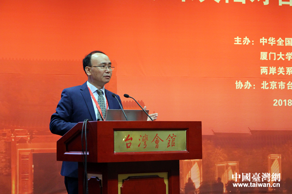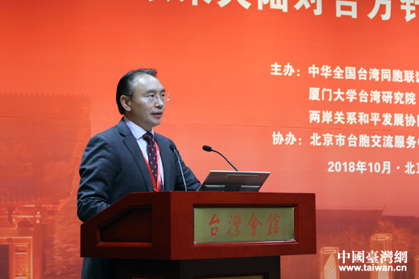 兩岸關(guān)系和平發(fā)展協(xié)同創(chuàng)新中心主任、廈門大學(xué)臺灣研究院教授劉國深在研討會上發(fā)言。(中國臺灣網(wǎng) 張潔 攝)