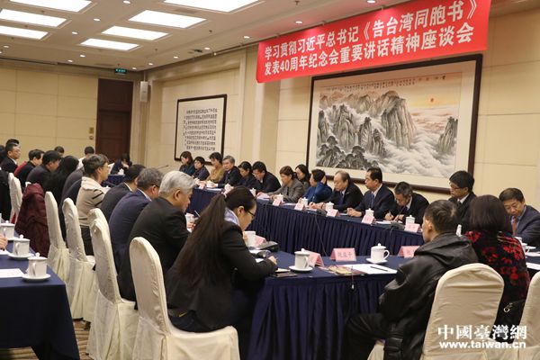 中國臺灣網1月4日北京訊(記者 李杰) 昨天下午,學習貫徹習近平總書記在《告臺灣同胞書》發表40周年紀念會上重要講話精神座談會在京舉行,會議由北京市副市長王紅主持,來自北京市黨派團體、臺胞臺屬、專家學者代表60余人參加了座談會,分享自己的體會和感想。北京市委常委、統戰部部長齊靜出席會議并講話。