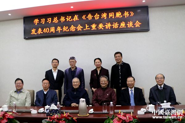 中國臺灣網1月7日北京訊(記者 李杰)今天下午,全國臺灣研究會在新會址北京文津國際公寓3層會議室,召開“學習貫徹習近平總書記在《告臺灣同胞書》發表40周年紀念會上重要講話精神座談會”。會議由全國臺灣研究會執行副會長王升主持,現任及前任會領導汪毅夫、孫亞夫、李亞飛、王在希、許世銓、周志懷,以及常務副秘書長楊幽燕、副秘書長鄭慶勇、嚴峻參加座談并發言。