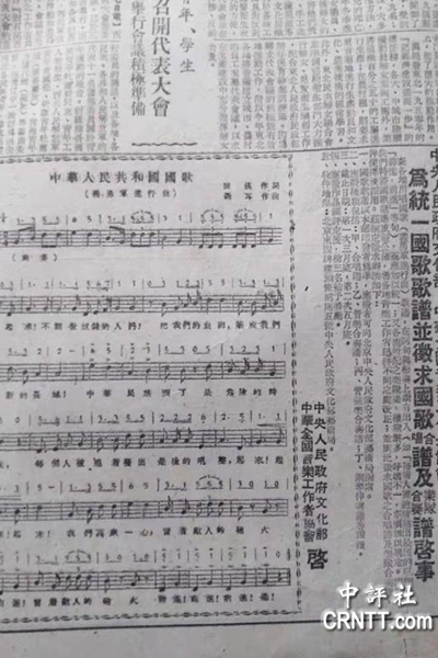 1950年3月9日《人民日報》第二版刊登《中央人民政府文化部、中華全國音樂工作者協(xié)會為統(tǒng)一國歌歌譜并征求國歌合唱譜及樂隊合奏譜啟事》(圖二)。其文謂:“查各地所唱國歌(義勇軍進行曲)歌譜,在詞句與節(jié)奏上頗有出入(如‘每個人被迫著發(fā)出最后的吼聲’‘前進,前進’等句),亟應加以統(tǒng)一;又各地所配之樂隊譜,種類繁多,好壞不一,亦須加以規(guī)定。因此,我們特將國歌歌譜重新公布,希各地音樂工作者迅將不同之處改正;并廣泛征求國歌之合唱譜及樂隊合奏譜,以便擇優(yōu)采用。茲制定征求辦法如下:一、國歌歌譜以本部印發(fā)者為準,各地應征者可向北京中央人民政府文化部藝術局函索;二、應征種類包括:甲、合唱譜;乙、樂隊合奏譜;丙、管弦樂合奏譜;丁、鋼琴伴奏譜等四種。三、截止日期:第一次三月底,第二次五月底;四、應征作品經(jīng)評定后,前三名給予獎勵;五、收件地點:北京市四牌樓頭條胡同五號中央人民政府文化部藝術局。中央人民政府文化部、中華全國音樂工作者協(xié)會啟”。