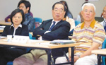 尤清與蔡英文隔著民進黨人士羅福全(中)聽取報告,互動尷尬。
