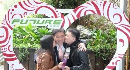 昨天,臺(tái)北市長(zhǎng)郝龍斌前往臺(tái)北國(guó)際花卉博覽會(huì)未來(lái)館,發(fā)放“玫瑰花心巧克力”給前一百名排隊(duì)民眾,共度一個(gè)浪漫的情人節(jié)。其中排隊(duì)前十名的情侶,還獲得與郝龍斌合照的機(jī)會(huì)。有趣的是,情侶不但彼此親吻,甚至還站在郝龍斌左右,一起親郝龍斌,讓他也露出靦腆的笑容。 點(diǎn)評(píng):看看笑容就知道,郝龍斌這個(gè)“燈泡”當(dāng)?shù)眠真不錯(cuò)。